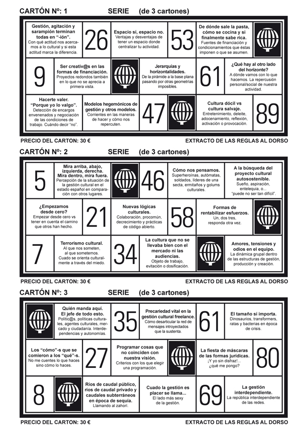 Se trata de un dispositivo extremadamente sencillo: el formato del juego de bingo modificado. En vez de un bombo del que salen números, las/os ponentes van hablando de temas que el público tratará de identificar y señalar en unos cartones construidos para la ocasión. Estos cartones en vez de números (algunos hay pero únicamente como recurso gráfico), tienen como casillas algunas de las cuestiones que se tratarán a lo largo del debate.